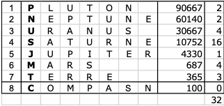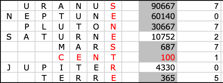 En ajoutant CENT à la suite des planètes et en retenant la lettre et le chiffre final du nom et de la période de rotation des planètes, on peut en déplaçant Jupiter décrypter SENESTRE et une approximation de la suite des chiffres de la 650.