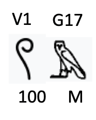 Une autre interprétation est liée au hiéroglyphe (voir Pierrette), la crosse correspond à la « corde enroulée », une sorte de noeud ou de demi-clé (?), qui est le symbole de 100 et le M a pour symbole la Chouette, 100 Mesures (voir l’obélisque), 100 chouettes, 100 « le coup de pouce de MV », 100 non codé, 100 de la 470, Mon 6eme vaut C ».(on peut voir aussi un sceptre S38)