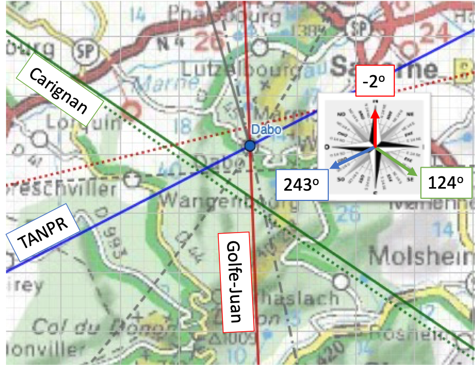Les 3 rochers peuvent s’inscrire dans un triangle équilatéral avec chacune des normales au plan du rocher à 120 degrés. Cette configuration est celle des 3 traits qui nous ont amenés à Dabo mais avec une rotation de 90 degré dans le sens rétrograde.