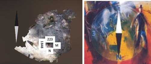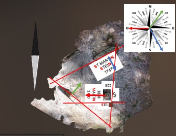 La borne parallélépipède » Martin Stein » peut représenter une boussole à partir des inscriptions. Le « N » inversé sur la face Sud peut indiquer le Nord, inversement comme sur la boussole de la 780. Le M sur la face Est fait office de la direction W. La face avec l’inscription 1828 est maintenant à l’Est et le 223 au Sud. Les faces opposées forment alors un couple chiffre-direction, 0223 N et 1828 M, un peu comme la boussole si on associe le S=5 et E inversé =3, donc 5N et 3M. Si on interprète ces couples comme 5 mesures dans la direction N et 3 mesures dans la direction W, cela fait 8 mesures/pieds au total soit 2.64m sur un déplacement en forme de L. Le piéton pirate avec sa jambe de bois, part du M pour faire des pas (difficile de mesurer des pieds avec une jambe de bois) possiblement moins long qu’un pas normal (74cm).