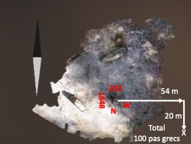 Les deux distances donnent ~10m et 27m pour un total de 37m. Si on choisit, un double pied pour le pas, alors on trouve 60.44 pas ~20m (19.946) et 163.64 pas ~54m, soit 224.08 pas de 0.66m~74m au total, c.a.d. exactement 100 pas grecs, 74 le nombre de lettres de l’énigme 780! 224=G en morse=Sol, une lumière .