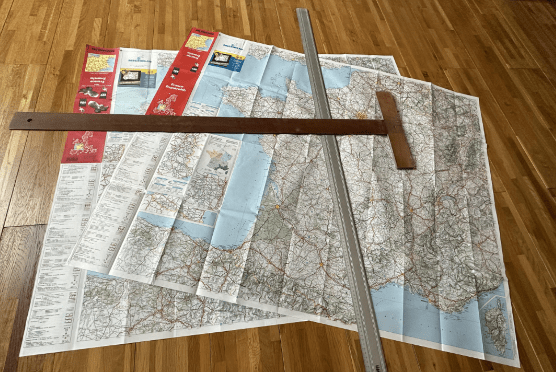 Michel a donné deux IS officielles, le poème de Pierrette et le tracé sur les cartes. L’IS #2 comporte deux cartes suggérant deux parcours à superposés, un trait sur la carte du dessous se prolongeant vers Leon en Espagne et passe dans une vallée encaissée dans la région de Los Picos de Europa, le « Caïn de Valdeon ». On remarque non loin Los Picos à 2640m. On note aussi sur ce visuel, le T et la règle qui forme une croix Lorraine ou un navire avec sa quille. La position et l’orientation de la règle et le T sont pratiquement celles du trait de Villequier et de la ligne de Fa. Enfin, le point de fuite du parquet suggère une construction en perspective, concept inventé par l’italien Alberti.