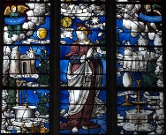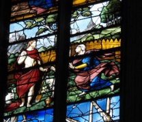 Revenons à Sainte Foy. Nous avions rencontré Foy d’Agen (la rime de la 530) et ensuite, en allant au Sud de Bourges à Conques. Foy vient du latin fines, is qui signifie la « lyre ». L’église éponyme est connue pour ces vitraux exceptionnels. On trouve entre autre, Moise qui tient un bâton dans le vitrail de la Manne, un peu comme le crayon du visuel et rappelle l’ouverture de la Mer Rouge. On note aussi que Diane de Poitiers était la donatrice de ce vitrail. On voit aussi Marie avec la lune, le soleil et l’étoile qu’on peut interpréter comme la lumière céleste dans une ouverture et un phylactère avec la litanie “Electa ut Sol, pulchra ut Luna,” c.a.d., « Choisie comme le soleil, belle comme la lune » et « stella maris » (étoile de la mer), « porta coeli » (porte du ciel). Enfin, Marie est agenouillée devant Jésus qui tient en main gauche une pelle qui évoque l’homme à la pelle du visuel de l’énigme suivante, la 650.
