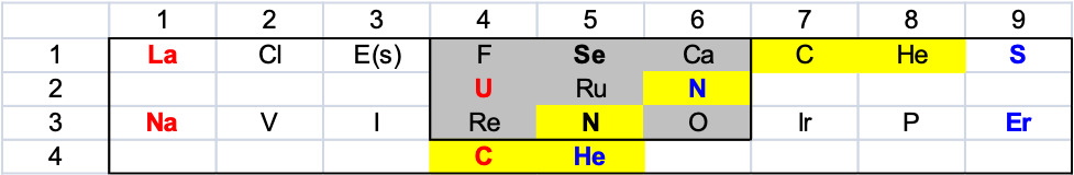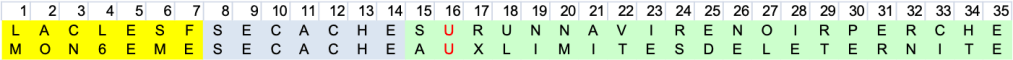La solution de la 580 nous donne le code A=0 et possiblement « MA » nous oriente vers les Masses Atomiques. Nous avons 26 chiffres dans la phrase codée (alphabet) et seulement 23 éléments (alphabet latin) avec une répétition pour les trois premières, He=2, C=6, N=7. Ces éléments sont d’ailleurs symétriques dans la forme du texte codé. On aurait donc CHEN ou si on prend A pour Azote au lieu de N, on obtient alors A-C-He, soit notre mauvaise rime de la 530. Cette correspondance est plus profonde puisque la syntaxe de la phrase une fois décodée et l’item 6 de la 530 sont identiques.