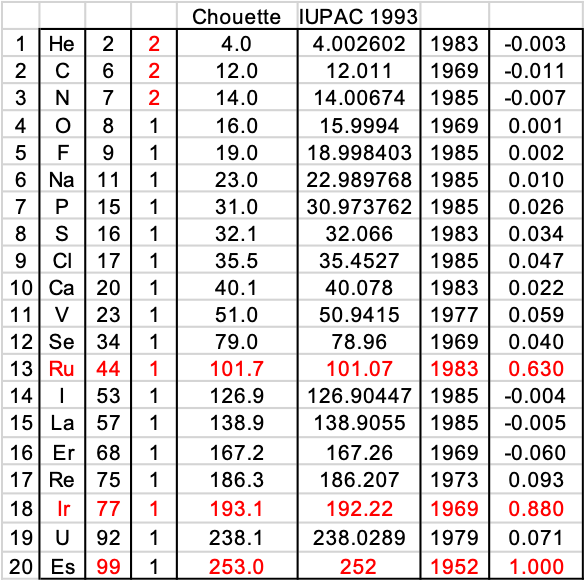 Il y a trois anomalies dans les masses atomiques. Le Ruthenium (44), l’Iridium (77) et l’Einsteinium(99) donc les chiffres doubles. A l’origine, le symbole de l’Einsteinium était E mais il fut changé en 1957 par l’IUPAC.