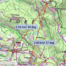 La dernière instruction de l’énigme 560 précédente nous permet d’arriver à la chapelle de Dabo, notre navire noir perché, notre nef encalminée, « home of Léon ». De « là », en examinant le secteur Est (Dos au ponant) sur une distance de 8000 mesures soit 2640m, on trouve les trois rochers du site de la/les borne(s) Saint Martin. La version du père Méhus avec une direction encore plus précise au Nord, Nord-Est 11 degré (NNE 11~ 22.5+11=33.5) confirme cette solution, même s’il reste un peu d’imprécision.