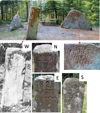 Outre ces chiffres et le nom St Martin, « la » borne St Martin est l’un des trois rochers sous la forme d’un petit obélisque avec des inscriptions sur chacunes des quatre faces: l’emblème de l’abbaye de Marmoutier, M avec une crosse (face ouest), « Stein » avec le N inversé (face Sud), 1750 and St Martin et 1828 (face ouest) et 223 (face nord).