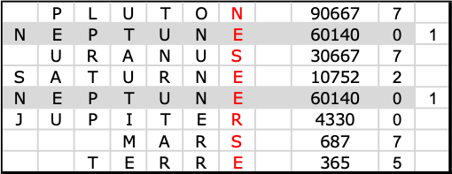 En 420, la suite des chiffres d’unité des périodes de rotation des planètes. Si on considère qu’en 470 et 580, A=1 et 0 se valent et que Neptune nous aide par 2 fois, on retrouve exactement la suite des chiffres du visuel. On remarque également que la suite des dernières lettres des noms des planètes forment un parcours de points cardinaux, sauf le R de JupiteR qui ici peut faire référence au ponant, O ou W ou bien si on cherche des paires, la lumière est au Nord…R=N.