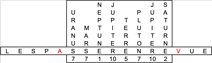 Enfin le passage en revue contient également la série des chiffres, encadré par les aiguilles noire A et blanche V de la boussole. Dans cette suite, il y a deux fois Jupiter qui vaudrait soit 1 soit 0 (ou 10) au lieu de Neptune.