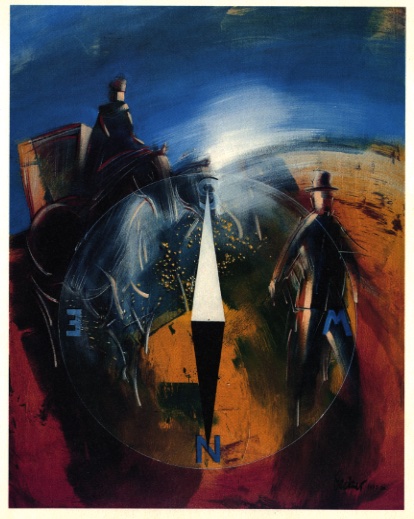 Jean-François Fernel est le premier scientifique à avoir mesurer la circonférence de la terre en mesurant un degré d’arc en marchant de Paris à Amiens. Puis il est revenu en carrosse pour confirmer sa mesure ce qui pourrait expliquer le piéton et la présence de la voiture hippomobile sur le visuel. En étalonnant la roue de son carrosse (l’utilisation du périmètre et non le diamètre de la boussole le suggère), il fait une tres bonne estimation du degré d’arc du méridien.