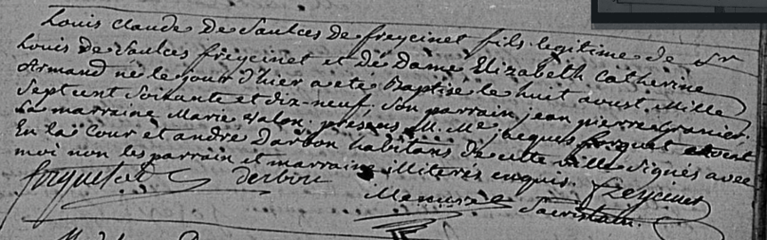 Louis de Freycinet naît le 7 août 1779 à Montélimar, non loin du château des Freycinet à Saulce-sur-Rhone. L’acte de naissance confirme le « de » et non « des » qui sera utilisé dans notre décryptage. Saulce réfère à l’arbre le saule ou « salix ». On retrouve sur le blason de la famille les 3 roses et un croissant de lune (pot aux roses!). La chapelle perchée et les clés de St Julien rappellent la chapelle de Dabo et le globe, l’Ordre des Chartreux.