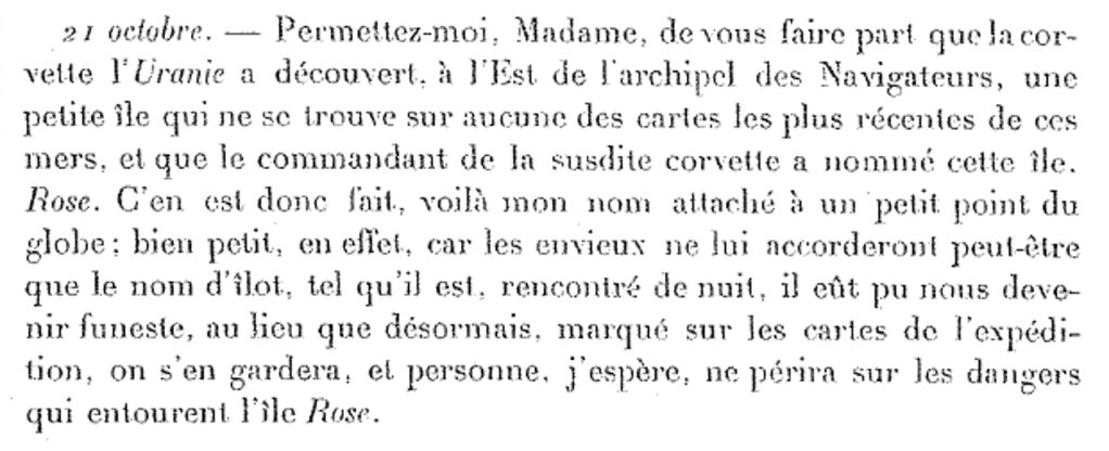 L’Uranie arrive à « Woahou » (Oahu, Hawai) puis part vers le Sud et passe près de l’ile Rose le 21 octobre 1819. C’est Louis de Freycinet qui lui donne le prénom de sa femme, Rose de Freycinet. L’île Rose est maintenant un atoll des Samoa américaines, point situé le plus au sud des États-Unis.