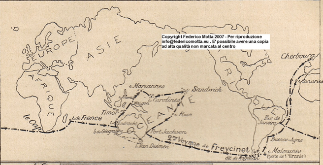 L’Uranie (initialement baptisé La Ciotat) partit pour trois ans (1817-1820) de Toulon pour un voyage autour du monde d’exploration, principalement pour réaliser des mesures scientifiques des champs magnétiques et gravitationnelles terrestre pour établir la forme de la terre. Ce voyage est dans la lignée des voyages d’exploration que les pays européens firent à l’époque tant pour les découvertes scientifiques que pour la politique de colonisation. L’Uranie s’échoue près de Port Louis dans les iles Malouines et l’équipage revient au Havre, le 13 novembre 1820 mais sur un autre navire, La Physicienne, anciennement Mercury.
