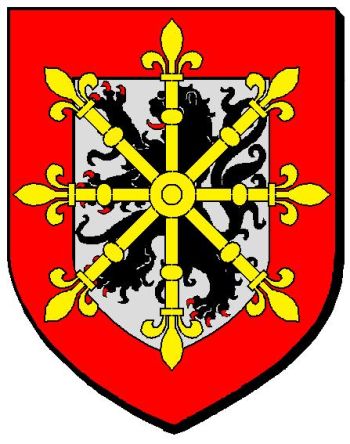 « D’argent au lion de sable, armé et lampassé de gueules, à la bordure du même, au rais d’escarboucle fleurdelisé d’or, brochant sur le tout. »