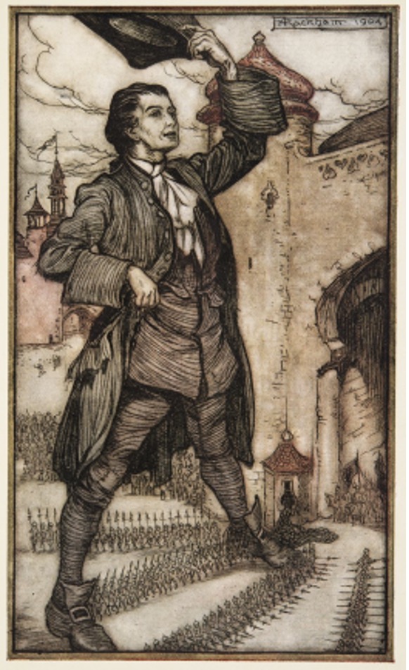 « L’empereur, ayant un jour donné ordre à une partie de son armée, logée dans sa capitale et aux environs, de se tenir prête, voulut se réjouir d’une façon très-singulière. Il m’ordonna de me tenir debout comme un colosse, mes pieds aussi éloignés l’un de l’autre que je les pourrais étendre commodément ; ensuite il commanda à son général, vieux capitaine fort expérimenté, de ranger les troupes en ordre de bataille, et de les faire passer en revue entre mes jambes, l’infanterie par vingt-quatre de front, et la cavalerie par seize, tambours battants, enseignes déployées, et piques hautes. Ce corps était composé de trois mille hommes d’infanterie et de mille de cavalerie. Sa majesté prescrivit, sous peine de mort, à tous les soldats d’observer dans la marche la bienséance la plus exacte à l’égard de ma personne : ce qui n’empêcha pas quelques-uns des jeunes officiers de lever en haut leurs yeux en passant au-dessous de moi. Et, pour confesser la vérité, ma culotte était alors dans un si mauvais état, qu’elle leur donna l’occasion d’éclater de rire. »