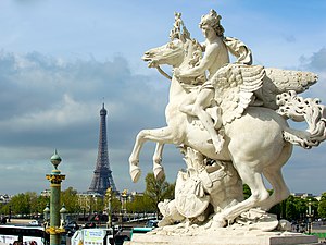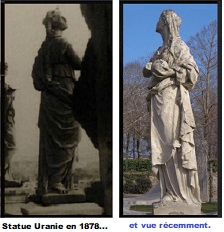 Avant de voir par l’ouverture la nef encalminée: Sur le Champs de Mars, on regarde vers le Nord-Ouest, on voit la Tour Eiffel, la Place du Trocadéro. Or, il y avait une statue d’Uranie d’Adolphe Itasse aussi sur l’ancienne Place du Trocadéro, sur le bâtiment autour de la cascade . Elle se trouve maintenant au square Bayard à la Roche-sur-Yon ((L) pour Lyon, manquant mis en exergue dans l’IS des RDV?). La statue mesure 2m40.