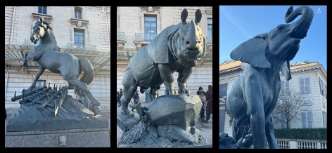 Dos au Ponant, cherche les sentinelles. L’histoire de la place du Trocadéro est riche et avant 1835, on y trouvait un grand nombre de statues qui ont été ensuite déplacées. En premier, Uranie est dès la démolition du Palais du Trocadéro, à La Roche-sur-Yon. Plus intéressant, 4 groupes d’animaux, Cheval, Éléphant et un singe, Le Rhinoceros et le bœuf/taureau, à l’origine au pied du palais autour de la fontaine.