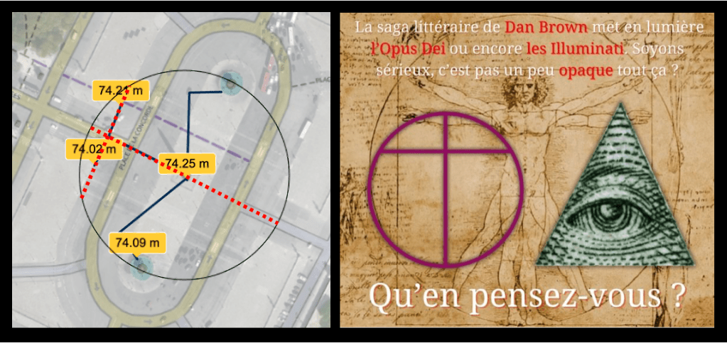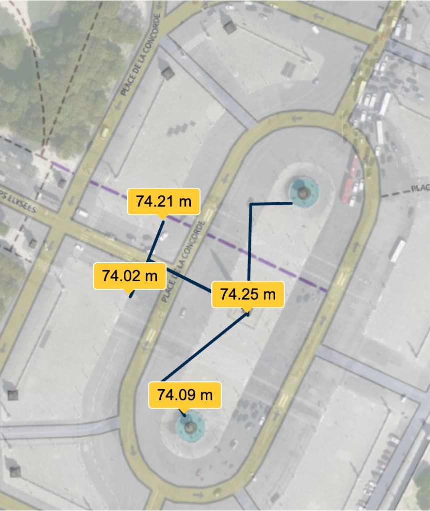 En 780, nous avions une boussole, c.a.d. un cercle. On peut construire un cercle de 64m, puisqu’on a 64 lettres dans le texte et la fontaine fait 10m pour les dix lettres du titre. Le cercle et l’obélisque symbole du soleil. Donc, la jambe du braquet passe à 54m, soit tangent aux deux fontaines. La distance totale du braquet de 74m formerait un cercle qui encerclerait les deux fontaines. Si on cherche une rosse et un cocher, nous avons les 2 chevaux de Marly à l’Ouest de la place avec leur cavalier et palefrenier et à l’Est, deux Pégase, l’un avec Renommée, l’autre avec Mercure..