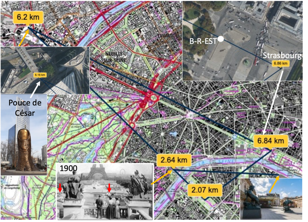 On s’aperçoit alors que le trait Strasbourg-Brest, est parallèle à l’axe historique de Paris et va jusqu’à la Défense. De même, le trait « à ne pas regretter », dans le prolongement du champs de Mars, passe par le jardin d’Acclimatation et les deux traits se croisent sur le pouce de César! « Ne dévie pas d’un pouce! » Le trait avec Uranie et le pouce rappelle le visuel de la 600.