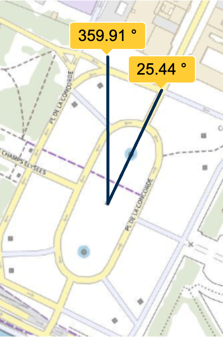 Tout d’abord la place de la Concorde comprend: (1) l’obélisque en position centrale, (2) deux grosses fontaines, les fleuves et les mers, alignées dans l’axe perpendiculaire à la Seine et celui de la rue Royale, (3) huit statues de villes sur le pourtour de la place, littéralement en position de sentinelles puisque positionnées sur des guérîtes, et quatre statues de chevaux à l’est et l’ouest. Les huit villes sont, en partant du nord de la France, Lille, Strasbourg, Lyon, Marseille, Bordeaux, Nantes, Brest et Rouen. Rouen se trouve pratiquement au Nord de la place, sur l’axe de la méridienne. L’axe de la place et donc les faces de l’obélisque sont en fait à 25.5 degrés N.