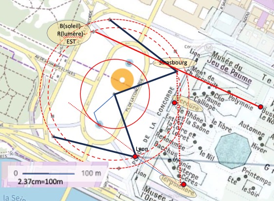 En 500, on se trouve à Carignan, la pointe droite du M du premier parcours. Le même sommet du M sur la place de la Concorde est Lyon, la ville en face d’Uranie. Si on prend la tangente au cercle des fontaines vers le Jardin des Tuileries et le musée de l’Orangerie, on trouve une série de statue Bacchus, Uranie, Euterpe, Cérès et Terpsichore.