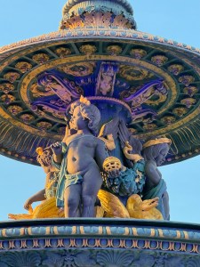 Apres la Fontaine des Fleuves au Nord, on s’intéresse à la Fontaine des Mers. Celle-ci se compose de 4 navires en croix selon les axes de la Place. Le sommet de la fontaine forme une vigie/nid de pie où se trouvent 3 génies symbolisant la navigation, le commerce et l’astronomie, cette dernière sous la forme d’Uranie ici bien « noire et perchée ». A ses pieds, on voit des cygnes qui rappelle celui du visuel de la 600. Elle est face àu Sud-Est, c’est a dire dans la direction de Lyon sur la Place de la Concorde et regarde le soleil couchant au Sud-Ouest.